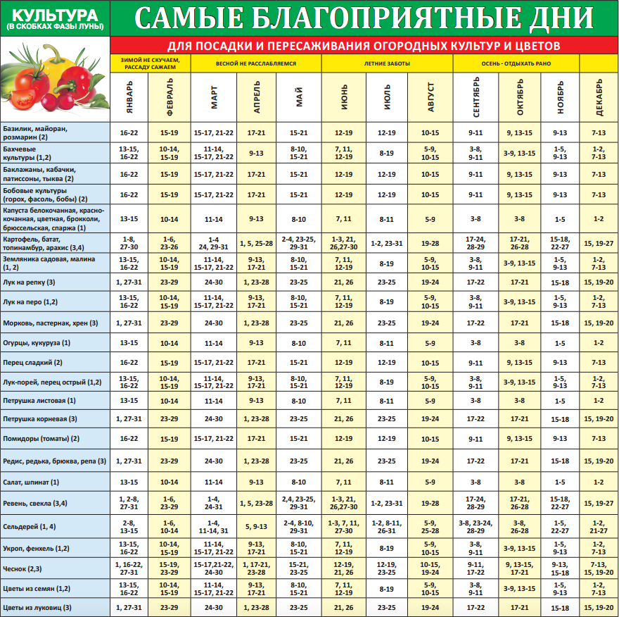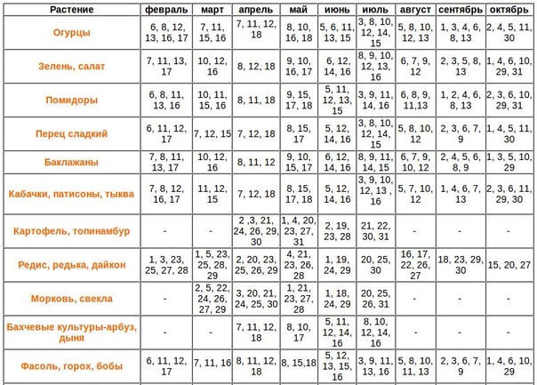 Плохие дни для посадок: 11, 18, 25 . Более подробная информация о благоприятных днях для каждой культуры находится в таблице выше.