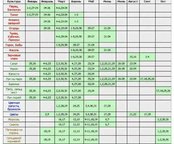 Посадить семена и рассаду в октябре можно в таких номерах: 2, 4, 20-22, 25, 30 (стебли и листья) 6-9, 16-18 (корни).