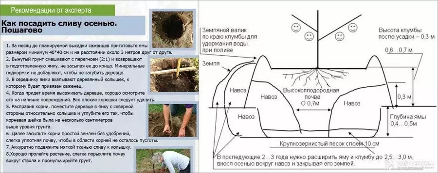 Непосредственная посадка сливыЕсли вы произвели все подготовительные мероприятия и дождались сроков, пора выполнять мероприятие. Посадить саженец сливы по правильной схеме поможет пошаговая инструкция:
