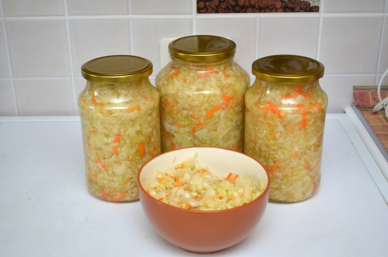 Капусту шинкуют, морковь трут на терке, солят и перетирают, чтобы выделился сок. Плотно укладывают капусту в банки, утрамбовывая толкушкой. Оставляют неплотно закрытыми при комнатной температуре на 3 суток, время от времени протыкая палочкой для удаления газа. Затем капусту плотно закрывают и убирают на длительное хранение в холод.