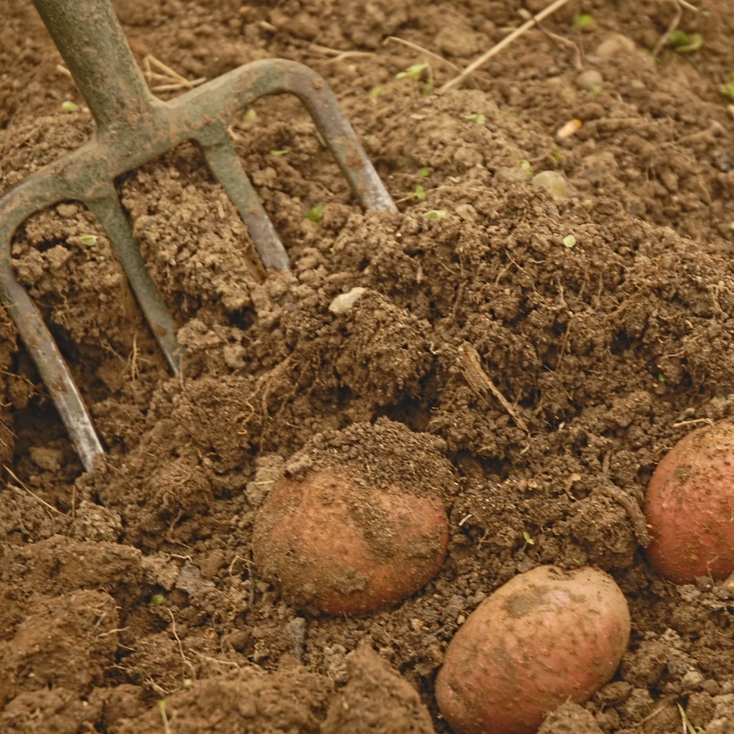 Подождите еще две недели, прежде чем аккуратно выкопать картофель вилами или лопатой.