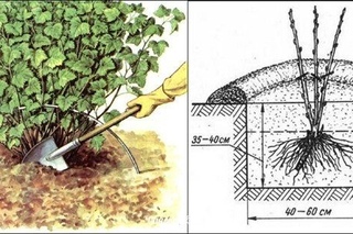 Куст придётся выкапывать, по возможности, с комом земли, стараясь как можно меньше травмировать корневую систему. Поэтому длина и ширина ямы должны быть минимум на 20 см больше, чем соответствующие параметры куста. Глубина, в случае 2–3-летнего растения, – не менее 60 см. А для куста смородины возрастом 6–8 лет эти величины могут быть и больше.