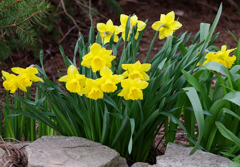 Размещая на клумбе различные сорта и виды нарциссов, продумайте, как они будут сочетаться по форме и палитре во время весеннего цветения.