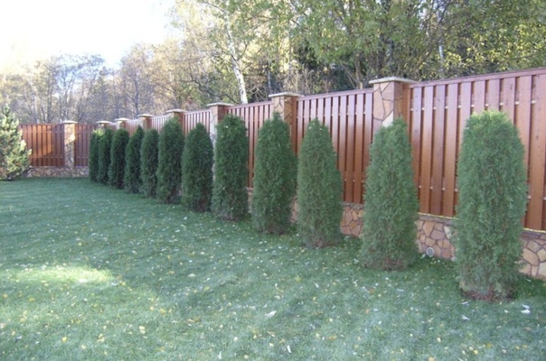 Тую можно оформить как живую изгородь, в этом случае деревья сажают в 50-60 см друг от друга.