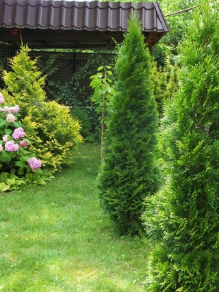 - Смарагд — высокорослое дерево, до 5 метров, но медленно растущее, до 10 см в год. Имеет колоновидную крону. Выращивается в контейнерах для садовых фигур или используется для создания живых изгородей.
