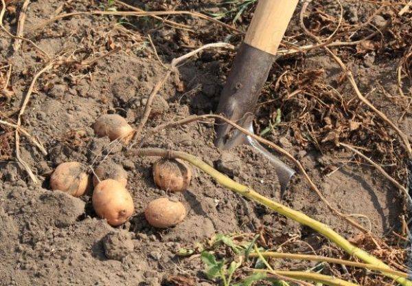 Корнеплоды располагаются под листьями на глубине 10-20 см. Если нет уверенности в том, что клубни готовы, то просто руками достают несколько картошин и отрывают их от корней. Если планируют убирать все растение, то руками выворачивают весь куст с корнеплодами.