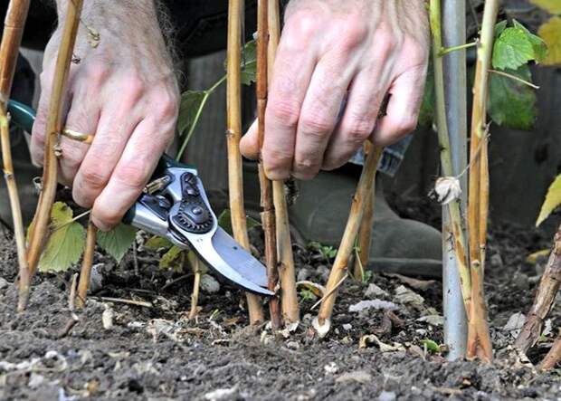 - на фото — обрезка малины осенью