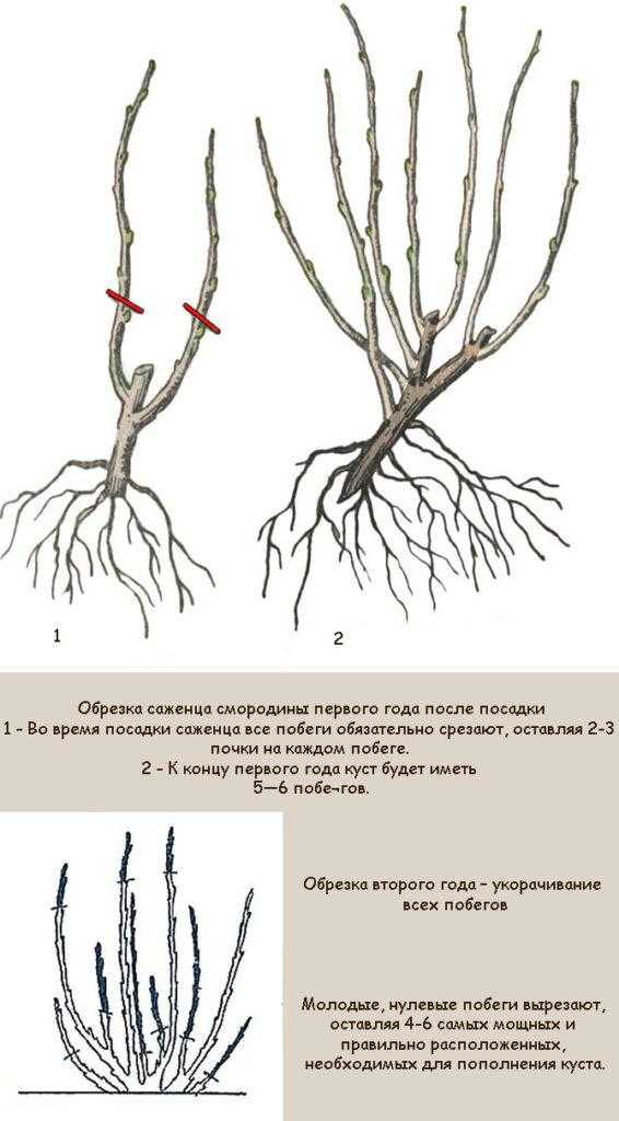 У саженцев смородины обычно бывает около 4 побегов. Сразу же после посадки их нужно обрезать так, чтобы на каждой ветке осталось по 2-4 развитые почки.