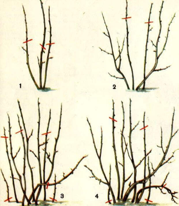 Для этого в первую очередь срезают или переводят на молодые боковые ответвления все ветви старше 5-ти лет, или старше 3-х лет, в том случае, если куст уже сформирован и имеет более 8-ми хорошо развитых 2-хлетних побегов. Затем укорачивают на треть все однолетние побеги.