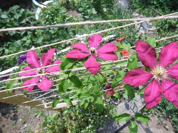 Эти клематисы цветут как на побегах предыдущего сезона, так и на новых побегах.