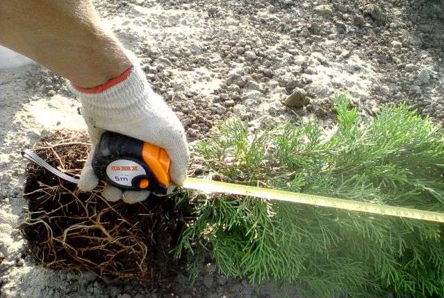 Затем нужно подготовить ямы для посадки саженцев туи. Глубина, размеры и расположение ям зависят от размеров самих высаживаемых туй с их корневой системой – посадочная яма должна быть такого размера, чтобы корневая шейка деревца оставалась снаружи и была слегка присыпана землей, а не заглублялась.