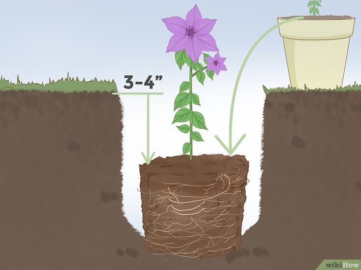 Если вы не собираетесь далеко, дайте клематису немного постоять в воде и стимуляторе корнеобразования. Затем поместите корни в отверстие и медленно заполните почвенной смесью. Не забудьте утрамбовать почву вокруг корней, чтобы не было воздушных карманов. При пересадке лианы клематиса сажайте ее немного глубже, чем обычно.