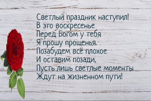 В Прощёное воскресенье верующие извиняются друг перед другом, чтобы начать пост с лёгким сердцем, с доброй душой. Когда знаешь, что на тебя никто не сердится, и сам не держишь ни на кого обид и зла, легче сосредоточить внимание на жизни духовной и встречать потом Пасху, зная, что у тебя нет грехов. Священник Савченко в беседе с «Вечерней Москвой» заметил: просить прощения 26 февраля лучше при личной встрече, однако, если такой возможности нет, можно извиниться мысленно. Помните ещё, что действовать нужно от сердца.