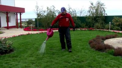В выбранный для посадки газона день погода должна быть сухой и безветренной, чтобы семена не затопило водой и не унесло порывами ветра. Перед началом посева необходимо внести минеральные удобрения и еще раз прорыхлить почву садовыми граблями.