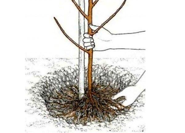 - Установите саженец и опорный колышек к нему. Корни расправьте и засыпьте яму свежей землей.
