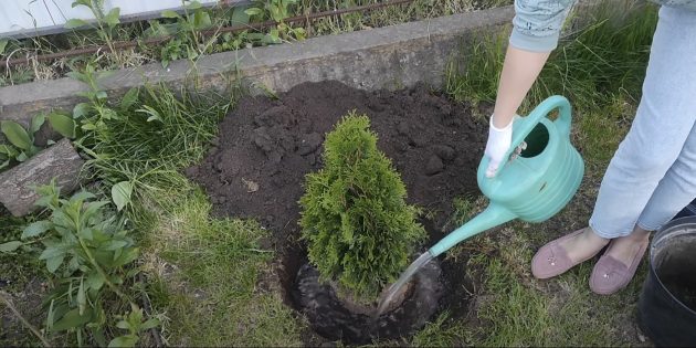 - Когда яма будет полностью засыпана, хорошо полейте почву, чтобы пропитать весь корневой ком.