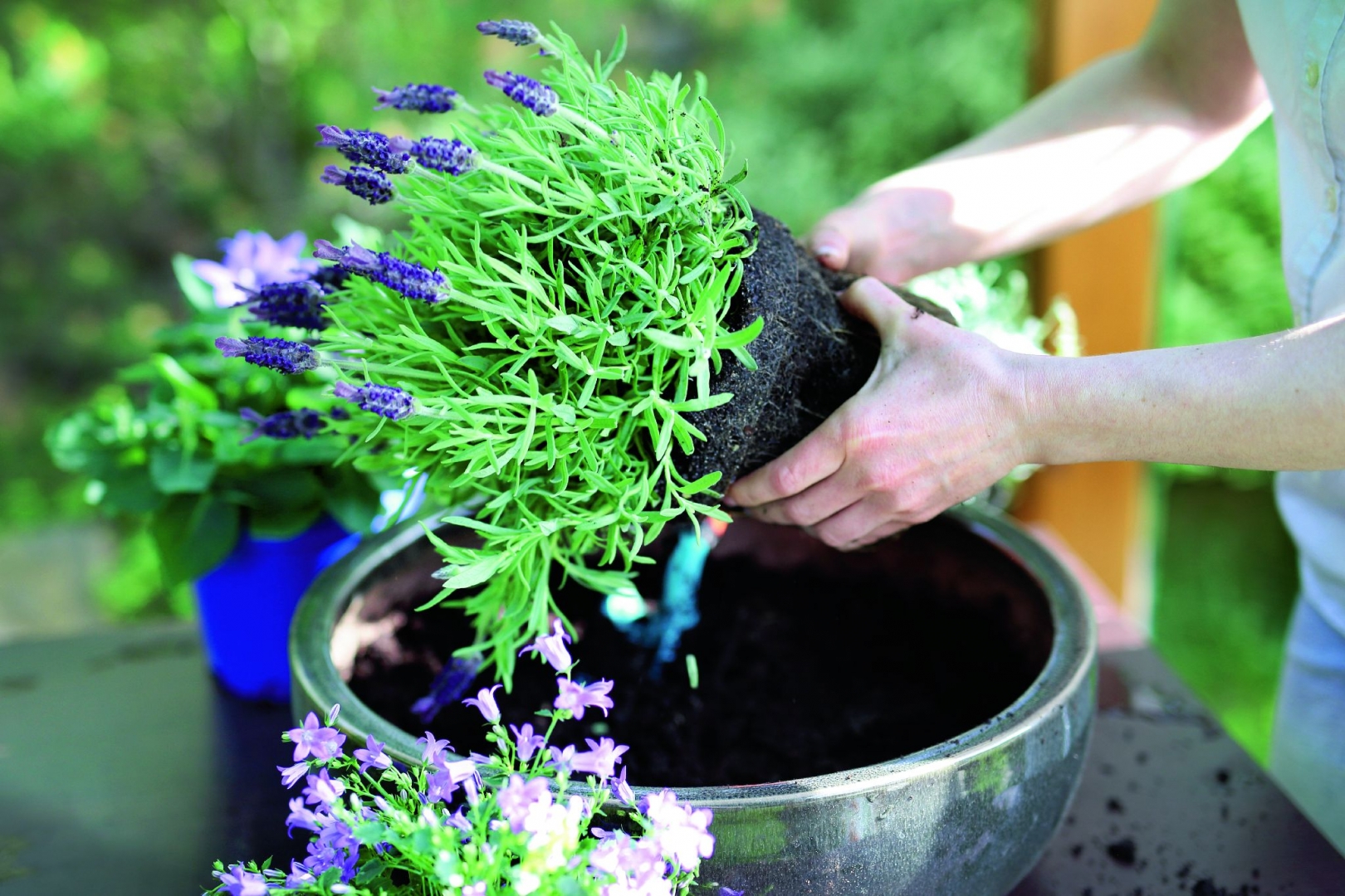 Состав — почва, пемза и глиняная галька. Лаванда подвержена корневой гнили, и дренажная смесь помогает предотвратить это.