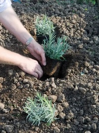 Как посадить лаванду? Посадка лаванды производится с расстоянием между сеянцами 80-90 см, а между кустами высокорослой лаванды соблюдается дистанция в 120 см. Глубина лунки должна быть такой, чтобы в нее свободно поместилась корневая система саженца. Корни перед посадкой слегка подрезают, затем устанавливают куст лаванды в лунку и закапывают его, заглубляя корневую шейку на 4-6 см. После посадки саженцы лаванды обильно поливают.