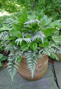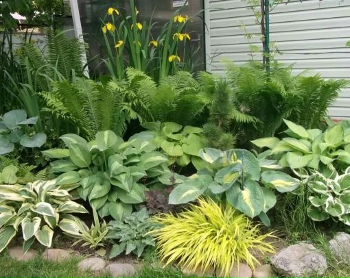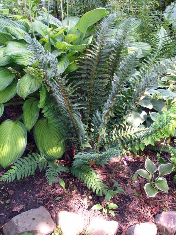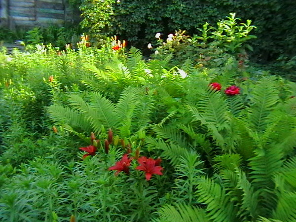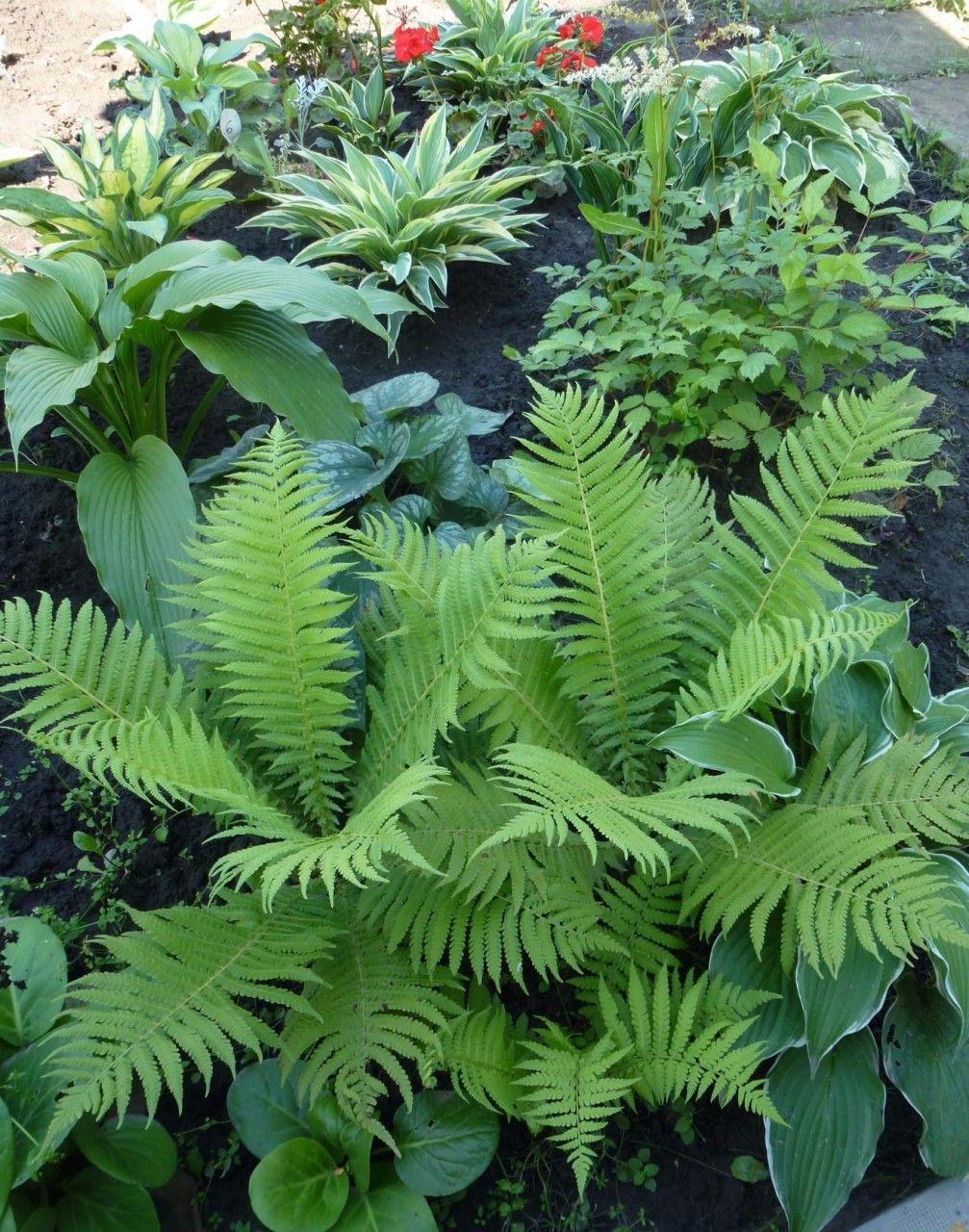 Можно сказать, что сочетание папоротников в саду возможно с любыми теневыносливыми растениями: хостами, астильбой, снытью и т.д.