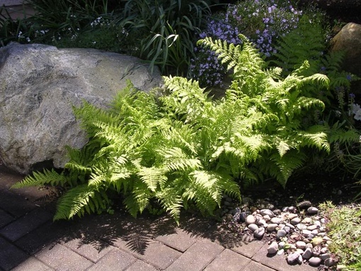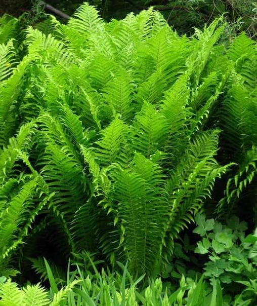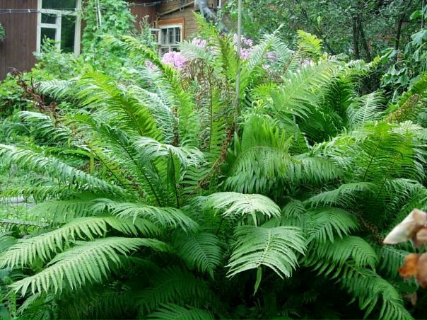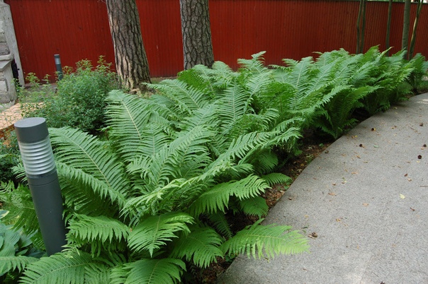 Крупные папоротники служат прекрасным фоном для травянистых растений; используйте их в просторном бордюре с крупными многолетними растениями, такими как ревень, шлейфовый мак, гибискус и хоста.
