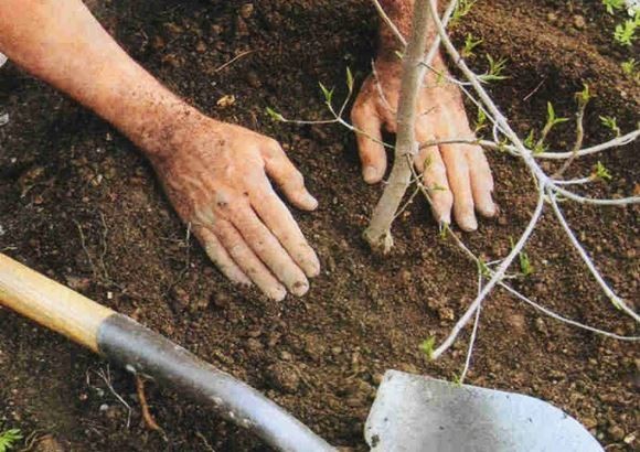 Корневая шейка деревца после посадки должна быть на поверхности грунта. Поскольку в процессе почва несколько осядет, место высадки должно быть на 5 см выше уровня земли. Засыпав корни, уплотните грунт и полейте двумя ведрами воды. После этого нужно привязать саженей к вбитому колышку при помощи мягкого шпагата, а после замульчировать перегноем, торфом либо перепревшим навозом.