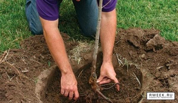 Выкапывается яма с параметрами 60х60 см. и с такой же глубиной. В нее вносится обычный перегной. Достаточно взять его в количестве 3-4 кг и смешать в пропорции 1:10 с землей из ямы. После этого около одного ведра данной смеси засыпается на дно котлована.При посадке ствол дерева опускается в яму на ранее насыпанную горку земли и перегноя. Ствол дерева устанавливается на вершине насыпа, а корни равномерно расправляются по его скатам.