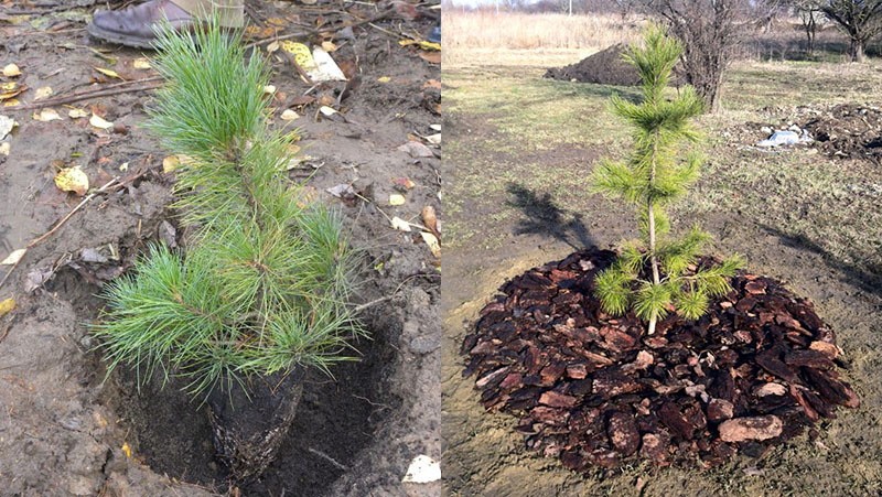 Так, саженец быстрее адаптируется к новому грунту. Присыпать яму плодородной землей (можно использовать готовый почвогрунт для хвойных из магазина). При этом следить, чтобы корневая шейка оставалась на поверхности, иначе сосна погибнет. Немного уплотнить землю и хорошо полить. После этого замульчировать опилом, соломой и т.п.