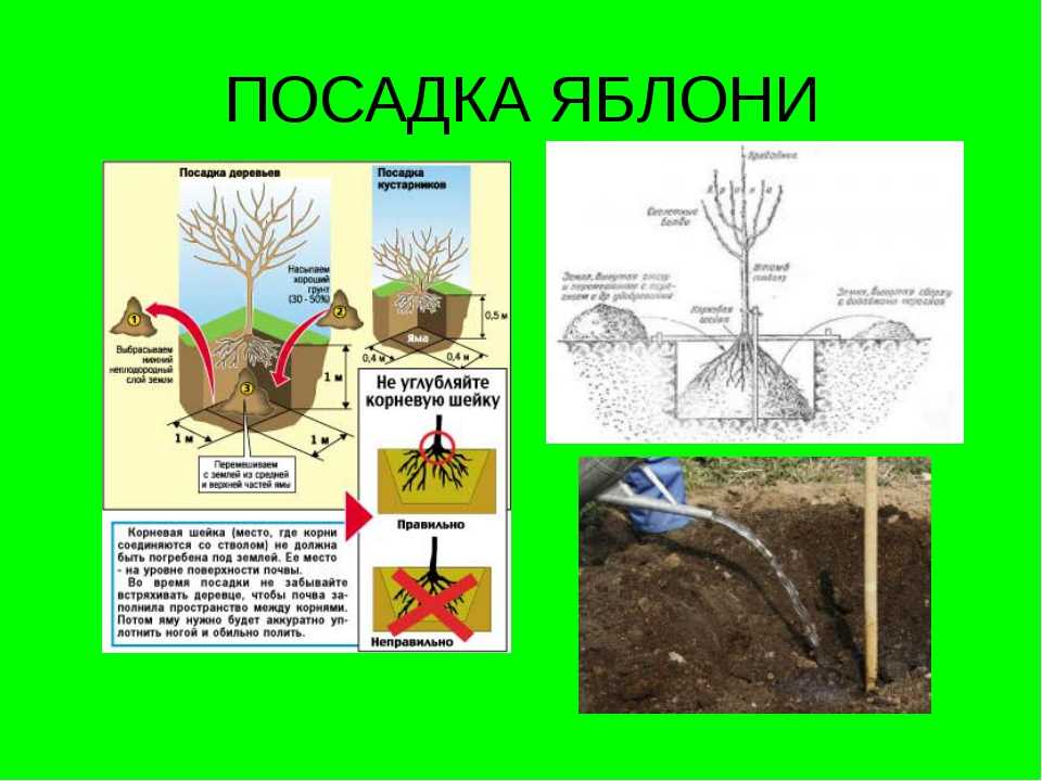 Важный момент при посадке яблонь — правильное заглубление саженца в яму. В хорошей почве достаточно глубины 60 сантиметров, на бедных грунтах — не менее 70. Если корневая шейка (граница ствола и корня) окажется глубоко в земле, дерево будет отставать в росте. При мелкой посадке подсыхают корни, из-за чего растение может погибнуть. Чтобы правильно определить положение корневой шейки, нижнюю часть основного побега протирают мокрой тряпкой и визуально определяют линию, где цвет коры переходит из зелёного в коричневый.