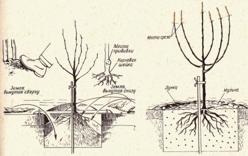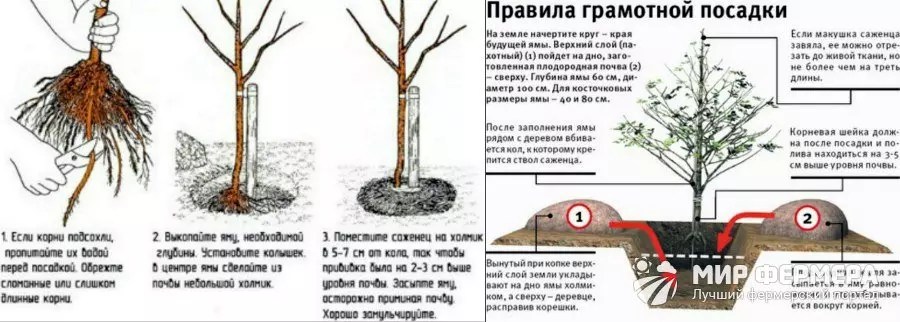 Деревце устанавливают в подготовленную ямку таким образом, чтобы его корешки возвышались над землёй на несколько сантиметров. Когда грунт просядет естественным образом, они займут своё естественное положение.Место прививки должно быть выше поверхности земли.