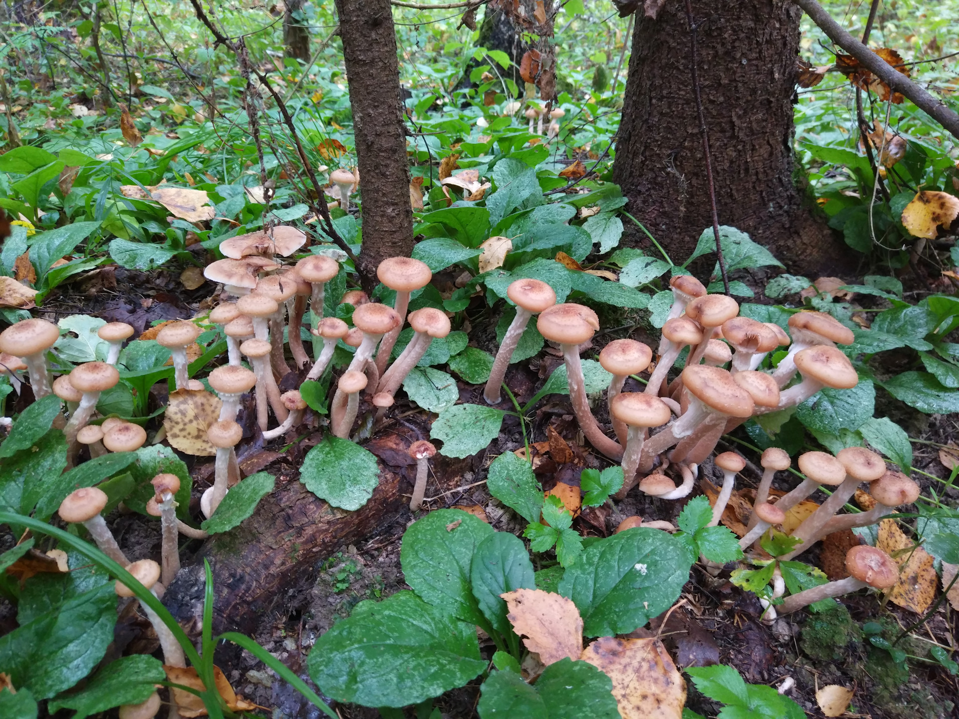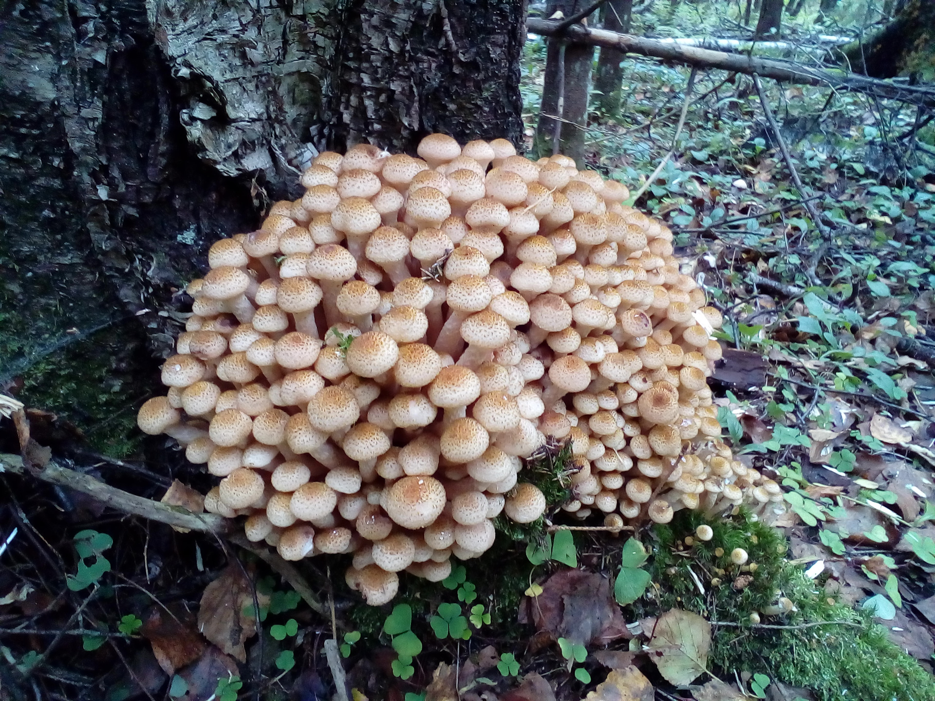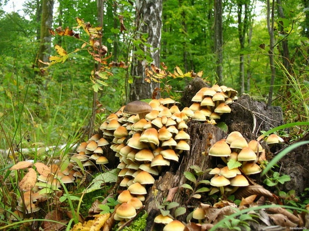 Фото 3. Порядочная «плантация» созревших плодовых тел опёнка осеннего на старых, уже почти перегнивших древесных остатках. Автор: Harlock81.