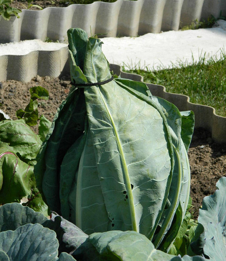 Это затемняет кочан, чтобы гарантировать, что он будет белым и нежным при сборе урожая (так называемое бланширование). Предполагается, что растения «самобледнеют», при этом листья естественным образом скручиваются над головой, но следите за ними, потому что им часто требуется помощь прищепки.