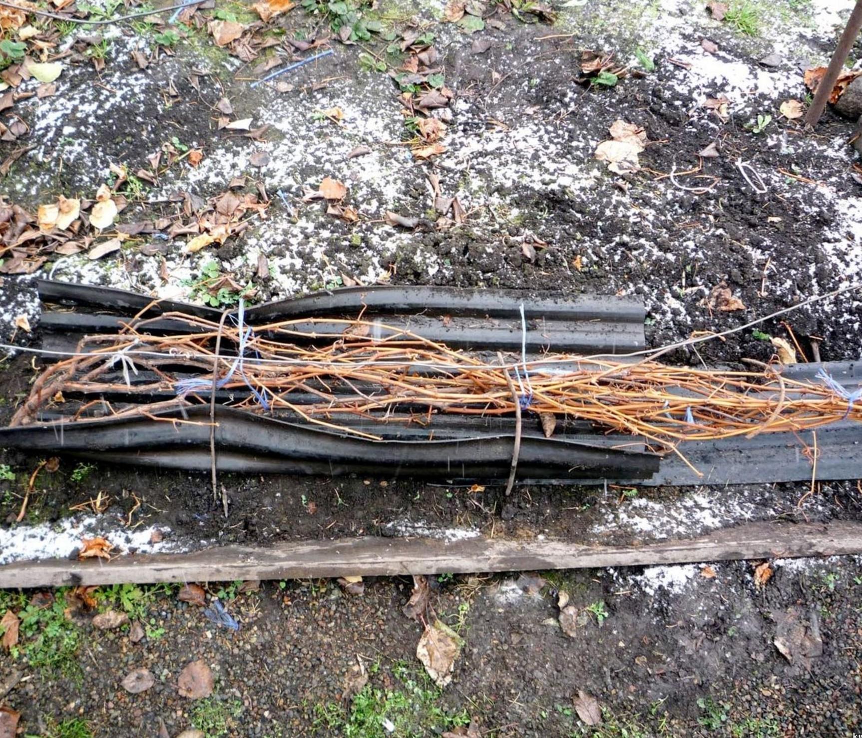Лозы уложены на доски и покрыты слоем соломы или тростника толщиной 20 см. По мере понижения температуры сверху добавляют такой же слой, скрепляя дугами, спанбондом или засыпая снегом. Чтобы грызуны не поселились, раскладывают ядовитые приманки.