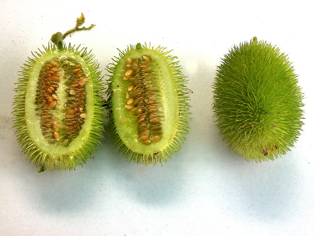 Плод имеет овальную форму, похожую на миниатюрную дыньку. Покрыт толстыми шипами, как у каштана, только мягкими. Мякоть напоминает светло-зеленое желе. Именно в мякоти находятся все семена. Они съедобны и кушать их безопасно. Те, кто употреблял в пищу этот фрукт, знают, что по вкусу напоминает смесь банана с огурцом. Некоторые утверждают, что по вкусовым качествам схож с дыней и лаймом.