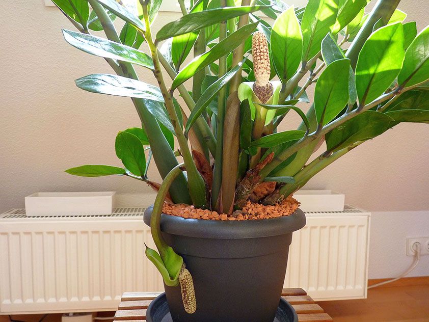 Мало кто может похвастаться тем, что видел цветущий замиокулькас. Расцветает обычно зрелое долларовое дерево. Красивым такое цветение назвать трудно, скорее экстравагантным.