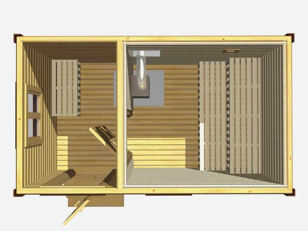 Если речь идет о малогабаритной бане, то здесь предбанник может быть заменен тамбуром (широким), в котором будет располагаться вешалка для одежды. Освещение такого тамбура будет осуществляться через окошко в наружной двери.
