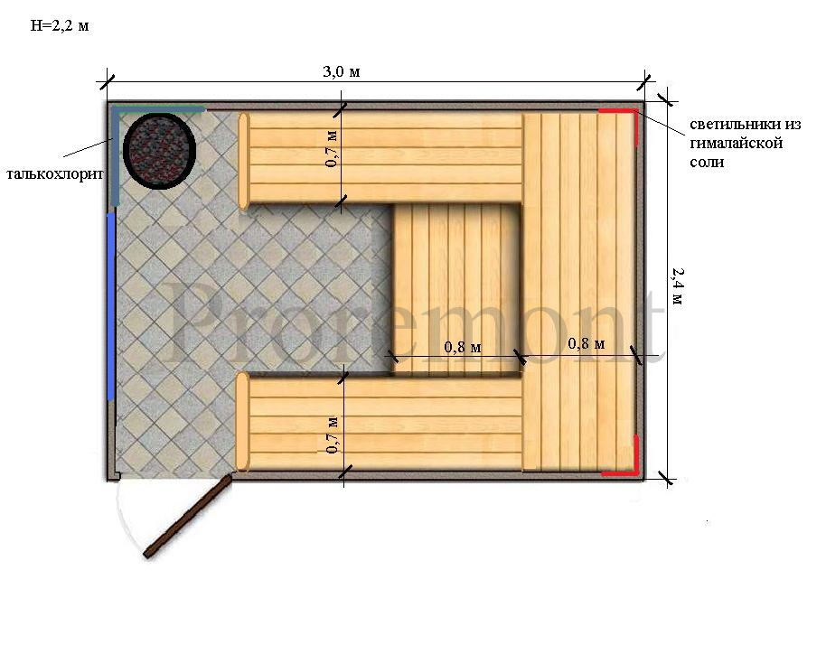 Если есть возможность то предбанник у входа хорошо было бы дополнить маленьким бассейном либо иной емкостью с холодной водой. Это позволит чередовать горячие водные процедуры с холодными.