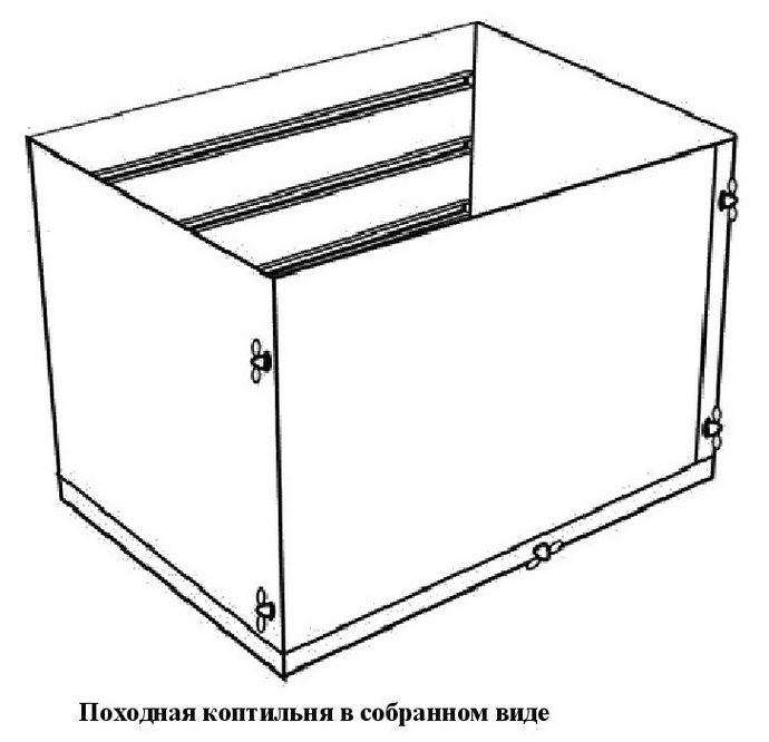 Данный вид коптильни имеет некоторые общие части с остальными видами подобных агрегатов, но и имеет ряд существенных отличий. Основа приспособления – корпус, изготавливаемый из стальных листов толщиной не менее 0,8 мм, лучше 1,5 или 2 мм. В местах стыка стенки и дно соединяются сплошным герметичным сварным швом.