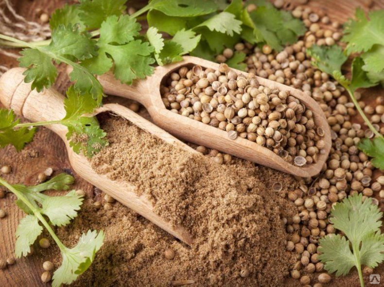 Эфирные масла, дубильные вещества и алкалоиды — важные для организма человека — содержатся в зернах. А витамины и разные микроэлементы есть в зеленых побегах, стеблях и листьях кинзы.