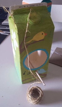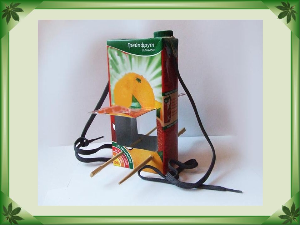 Кроме пакета от сока, который предварительно надо вымыть и просушить, вам также потребуется бечевка и острый канцелярский нож. Чтобы сделать с такого пакета яркую и оригинальную кормушечку, можно также использовать пленку-самоклейку или разноцветный скотч с принтом.