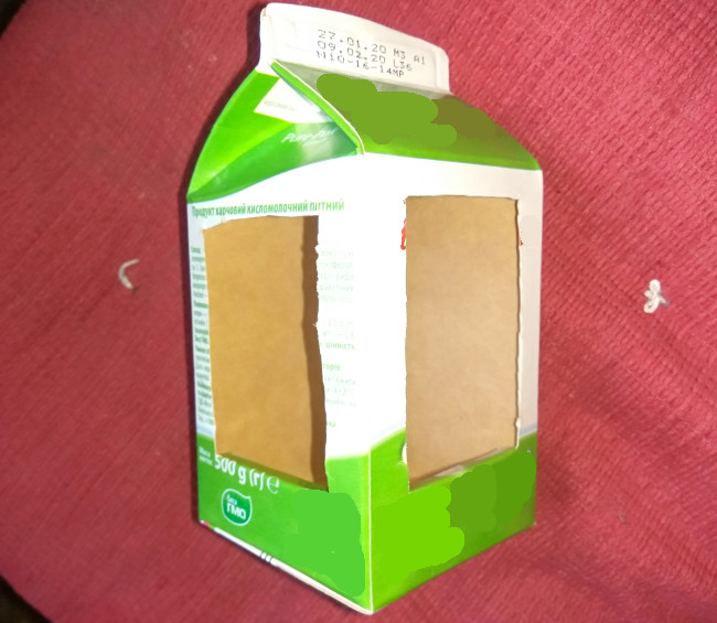 Вырезаем окошки для птичек друг напротив друга. Форма и размер должны быть такими, чтобы птица могла легко залететь и вылететь из кормушки.