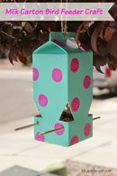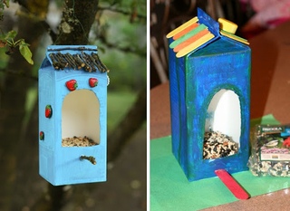 Здесь все предельно просто – вырезаете с одной или всех четырех сторон отверстия так, чтобы они были чуть выше дна, насыпаете корм и подвешиваете кормушку. Для того, чтобы птицам удобнее было сидеть во время еды, можно возле каждого отверстия соорудить насест, например, из деревянной палочки от мороженого. Чтобы такая кормушка смотрелась интереснее, можно обклеить ее снаружи цветной бумагой или даже сделать аппликацию в виде забавной рожицы.