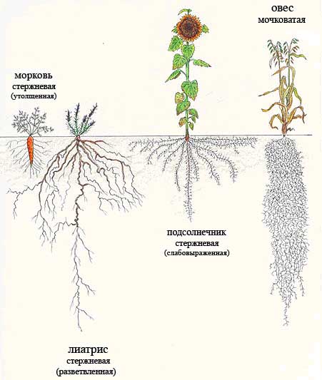 Подсолнечник имеет стержневую корневую систему. Главный корень образуется из зародышевого корешка семени и интенсивно растет в вертикальном направлении вниз. На главном корне образуются боковые корни, которые вначале растут горизонтально, а затем вертикально вниз.
