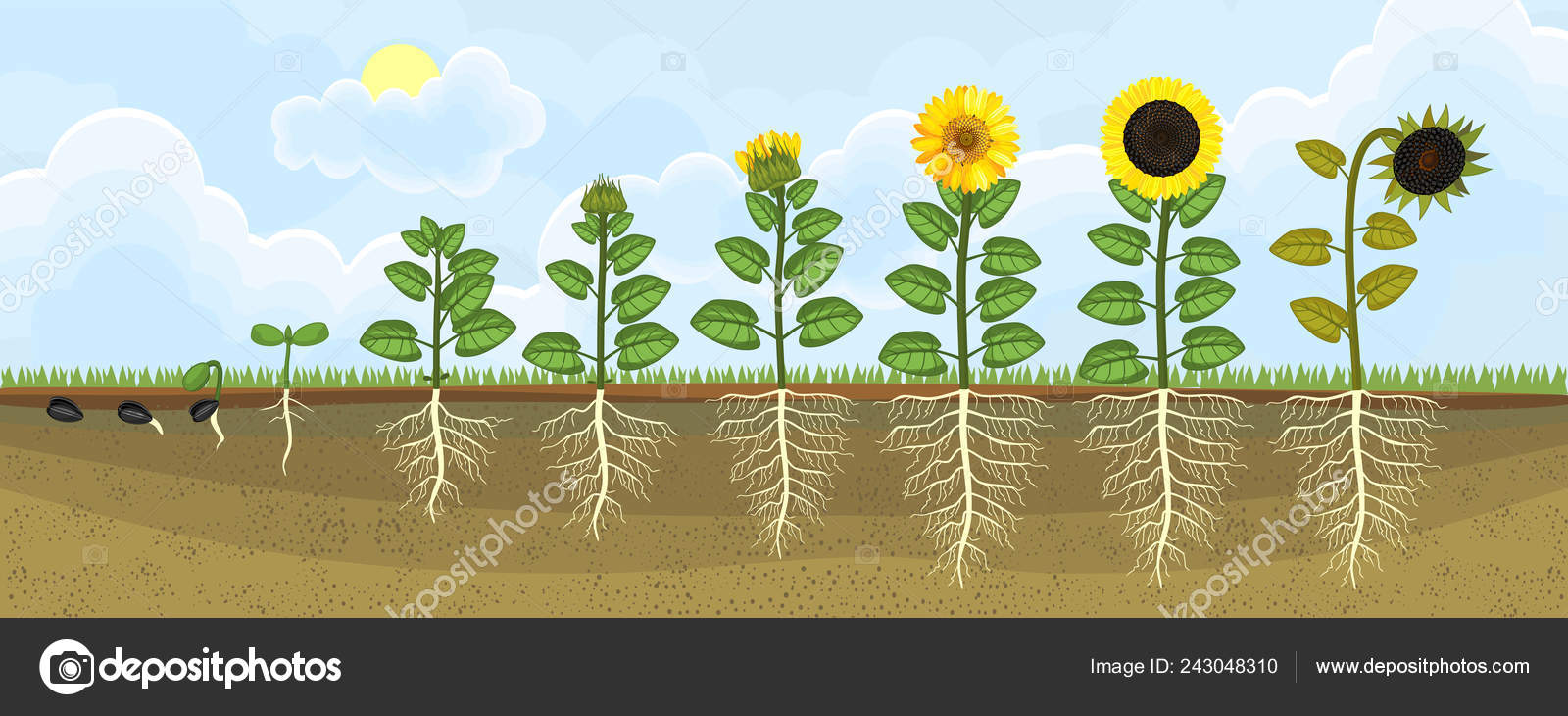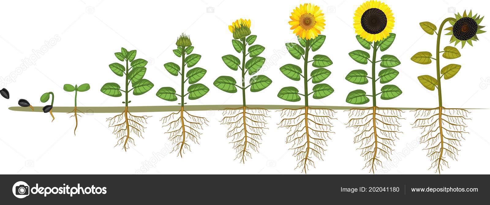 Рост корней подсолнечника, особенно в молодом возрасте, значительно опережает рост стебля. В фазе 4-5 листьев корневая система проникает в глубину на 80-100 см. К моменту образования корзинки рост корней прекращается.