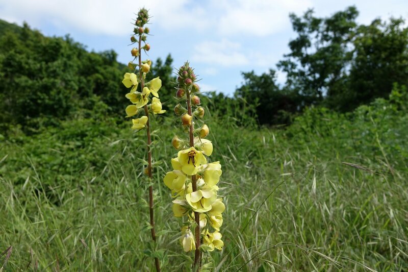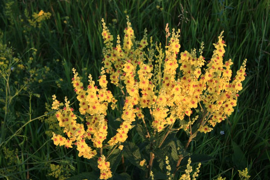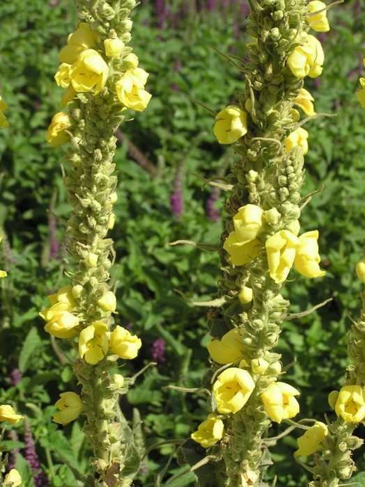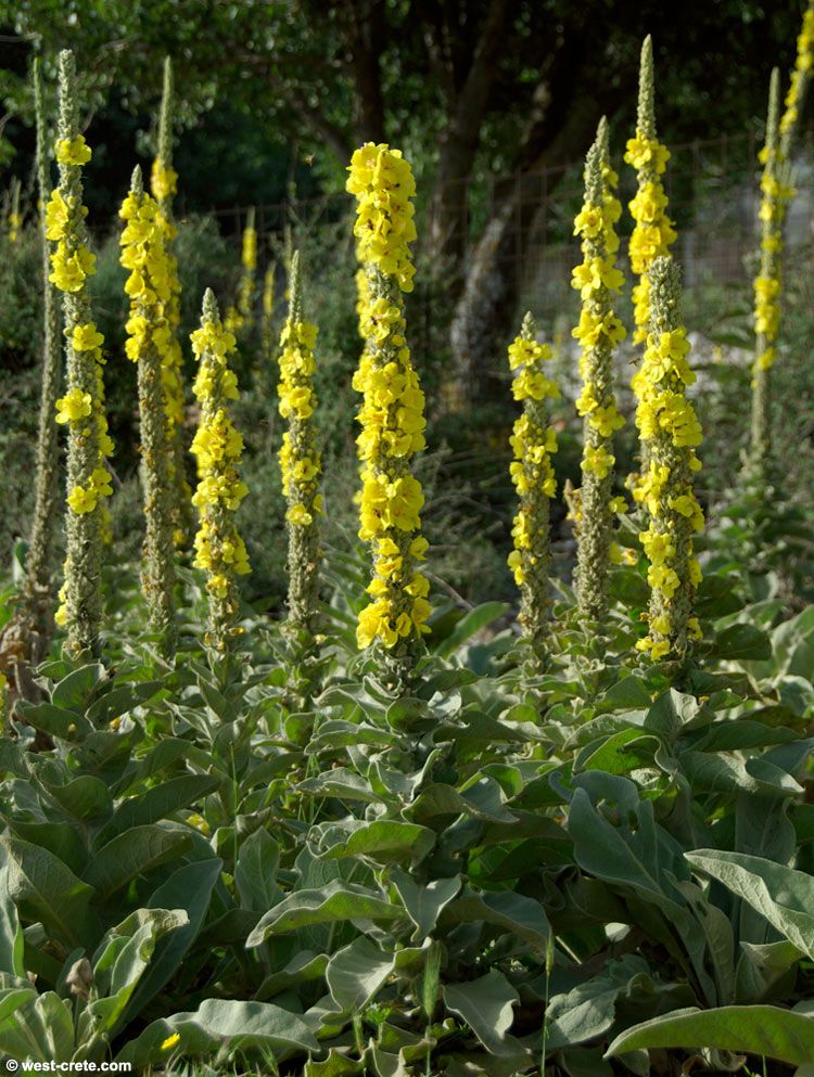 Коровяк скипетровидный (густоцветковый). Растение высотой 20-120 см имеет толстый, прямой стебель, который густо покрыт листвой. Нижние овальные листья достигают 10-40 см в длину, а размер верхних составляет всего 4-10 см. Длинное колосовидное соцветие усеяно пучками желтых цветов.