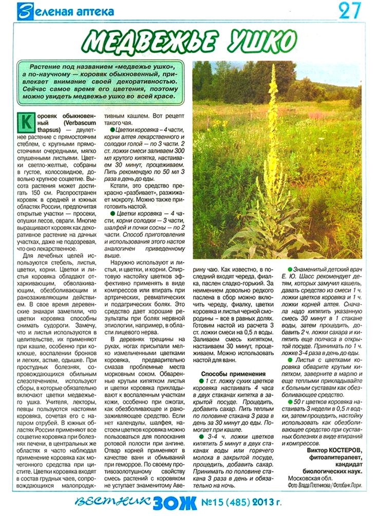Назначают его также при диспепсии, гастритах, колитах. Врачи часто рекомендуют принимать коровяк вместе с листьями мать-и-мачехи, корнем солодки, цветками липы. Цветки коровяка входят в состав многих грудных чаев.