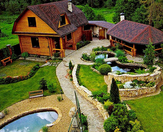 Здесь тщательно необходимо выбирать все элементы, учитывая из какого материала, они сделаны, какой цветовой палитрой обладают. Можно соорудить небольшую изгородь из живых растений или водоем. При этом имеется ряд принципов, которые следует соблюдать: