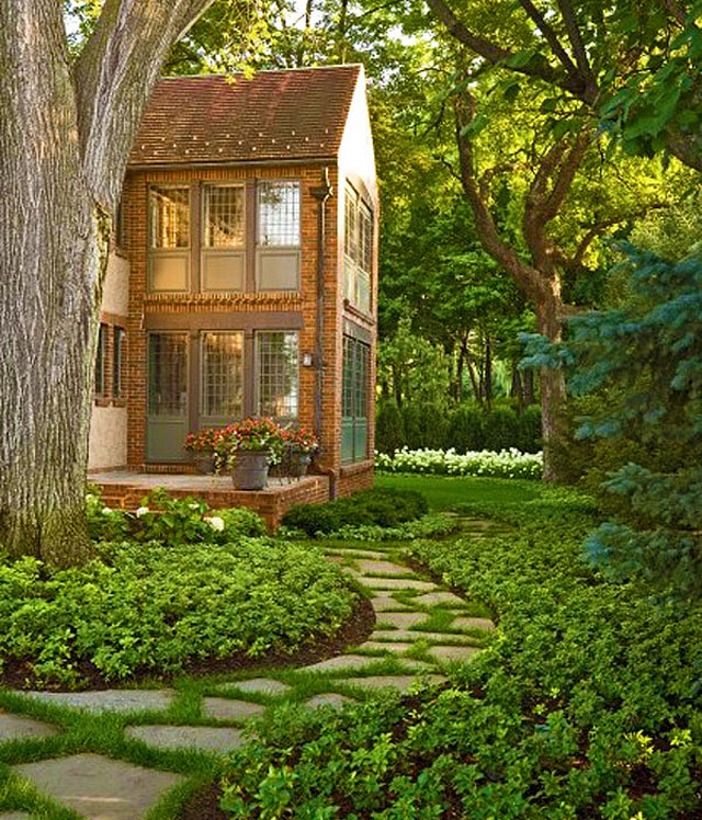 Выкладывая тропинки из дерева, бетона или кирпича, нужно иметь в виду, что их необязательно делать сплошными, более привлекательным вариантом станут дорожки с естественными зелеными просветами.