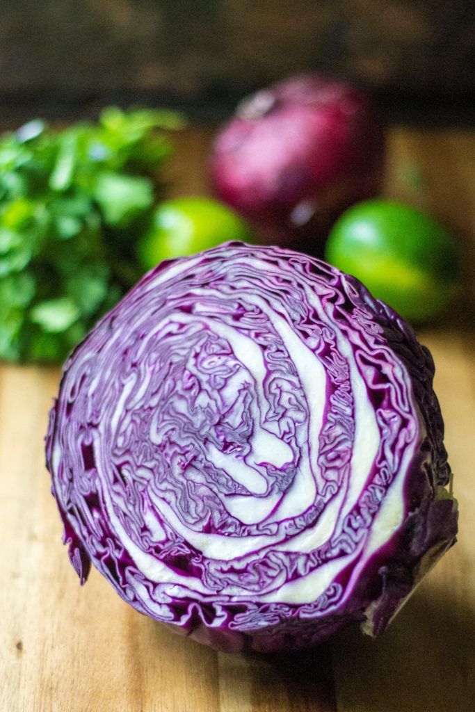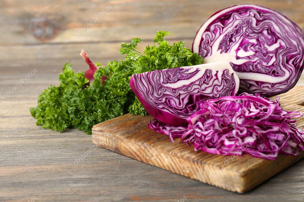 Краснокочанная капуста принадлежит к семейству капустных. Её плотный кочан отличается красно-зелёными внешними и гладкими, красными внутренними листьями. …»