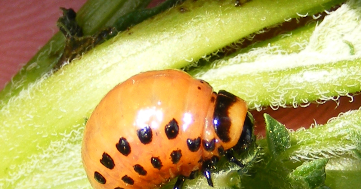 - Личинка: Мягкая личинка от красного до оранжевого цвета с черной головой, черными ногами и, когда она крупная, с двумя рядами черных пятен на каждой стороне тела.Часто встречается либо на нижней стороне листьев, либо на верхушке картофеля.