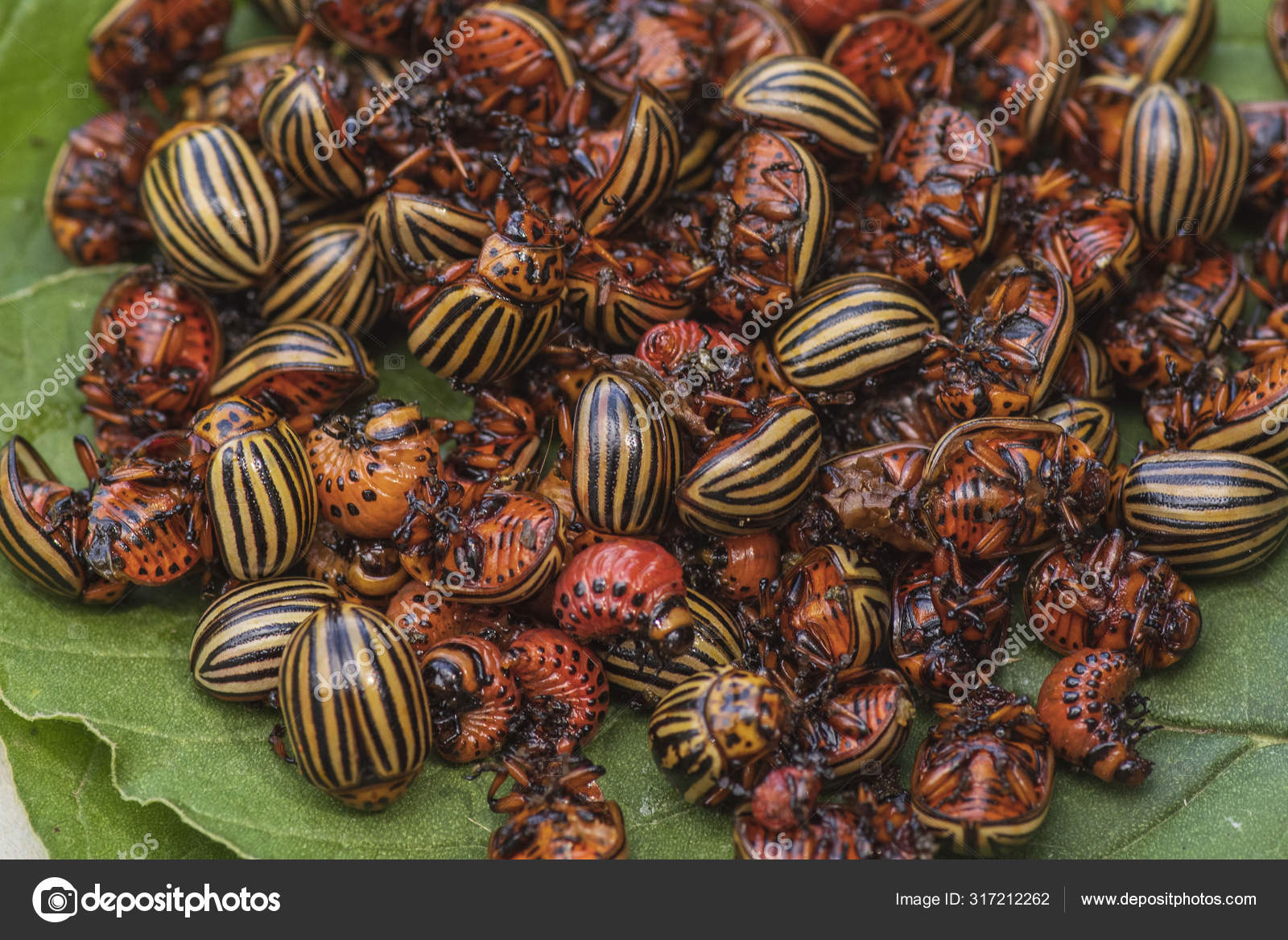 Сначала личинки имеют кирпично-красный цвет с черной головой, но с возрастом постепенно становятся более розовыми.У них также есть две линии черных пятен. Самые молодые личинки довольно малы, и их может быть трудно увидеть, но вы, вероятно, заметите их повреждения, а более старшие личинки созревают от одной до двух недель, трижды линяя перед их наиболее разрушительной последней личиночной стадией. Затем личинки падают на землю и закапываются, чтобы окуклиться еще на 8–15 дней, прежде чем вырастут во взрослые особи, готовые к употреблению и производству новых колорадских жуков.